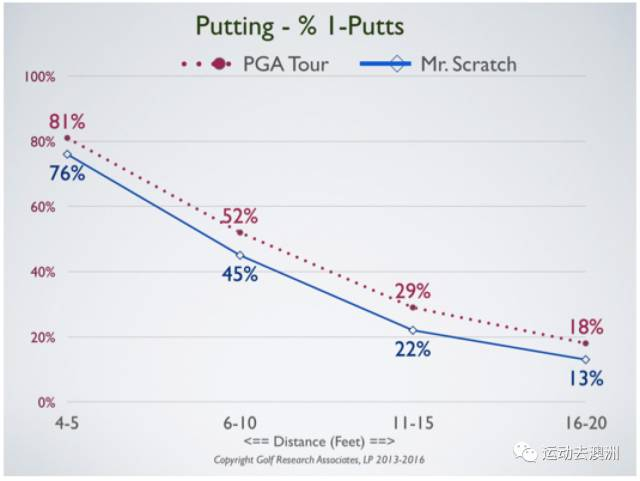 再说回来,作者用27年积累的数据对职业球员和零差点业余的数据进行比较(其中职业比赛数据总计14557轮,0差点业余数据8360轮,可以充分代表这两个群体的平均水平)