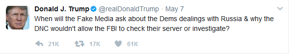 上周日,他在推特上采用另一种策略写道:“假媒体什么时候会问民主党与俄罗斯的交易,以及为什么民主党全国委员会不允许FBI检查他们的服务器,或者对他们展开调查? ”