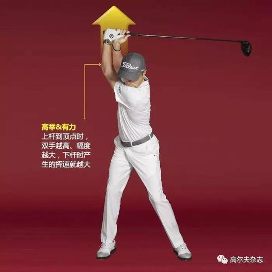 在我的成长过程中,我模仿过泰格的挥杆。我很喜欢他在上杆到顶点时双手高高举起。高举双手保证了挥杆的宽度——并积蓄能量——到了那样的高度就能形成这些。(如果上杆到顶时双臂垮掉的话,你就可以跟力量说再见了。)无法将双手像我那样举那么高?没关系。只要你尽最大努力让双手远离头部,就可以迎接最大挥速了。