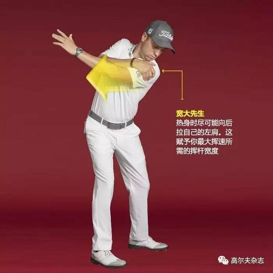 如果你和大多数业余球手一样,会做那种我称之为“假转”的动作。我总是能看到:你不是真的转动自己的肩部——而是抬起肩部。这样背部不可能指向目标,从而削减了挥杆的宽度和击球距离。如何修正?不拿球杆做模仿上杆的动作。当你无法继续向后转动时,用右手抓住左肩再向后拉几英寸(如上图)。让自己的背部正对目标并保持这个姿势。你应该感觉到肩部和腰部的肌肉拉伸。如果你能在真实的挥杆中重现这种感觉,开球距离就能增加10码。