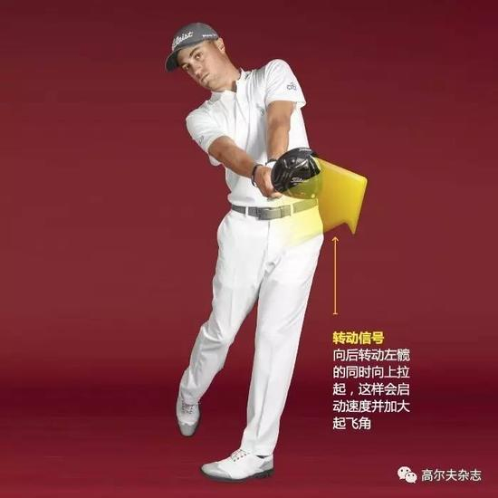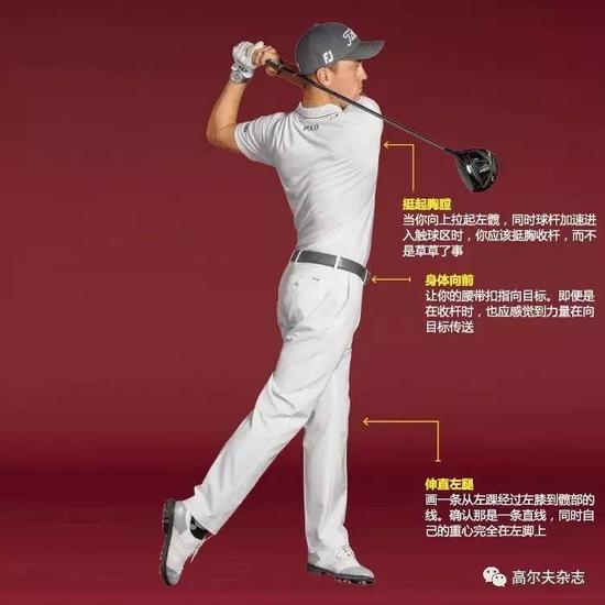上杆顶点的“能量加宽度”是一种很棒的感觉——你可以毫无畏惧地全速挥杆。那就是我今年两次开球超过400码的原因。下杆是整个挥杆中简单的那部分。只需简单地通过快速打开下肢,将上杆蓄积的能量传送到小球上。不要单纯地拼命练习动作。将自己集中在单一的挥杆理念上:向上、向后拉自己的左侧髋部。这能启动你从顶点向下的动作,并让杆头全速通过击球。向后转动左侧髋部有助于你在击球过程中充分转动,同时向上送出左髋会在击球时形成更大的动态杆面角。我不仅是赛场上击球最远的球员之一,我还是动态杆面角最大的球员之一。平均起飞角13度让我在巡回赛中排名第13名。当你用1号木杆开球时,高度是你的好朋友。如果你达不到我那117英里/小时的挥速,你可以提高起飞角来增加距离。