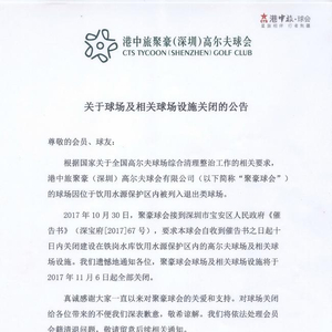 根据国家关于全国高尔夫球场综合清理整治工作的相关要求,港中旅聚豪(深圳)高尔夫有限公司(以下简称“聚豪球会”)的球场因位于饮用水源保护区而被列入退出类球场。2017年10月30日,聚豪球会接到深圳市宝安区人民政府《催告书》,要求收到催告书之日起十日内关闭建设在铁岗水库饮用水源保护区内的高尔夫球场及相关球场设施。我们遗憾地通知各位,聚豪球会球场及相关球场设施将于2017年11月6日起关闭。