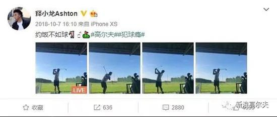 而释小龙应该学球不久,根据他的微博记载,去年7月才第一次抓鸟。去年10月,他连发几条自己练球和打球的微博,说“约饭不如约球”,并都打上了“高尔夫”“犯球瘾”的标签(👇)。