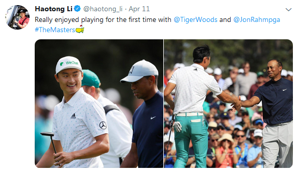 这是李昊桐第一次与伍兹同组比赛,第一轮比赛结束后,他也更新了社交媒体。