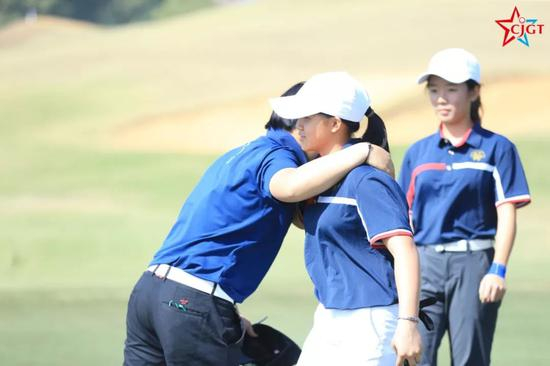 来自聚龙河南实验鸿运青少年高尔夫代表队的赵翊涵和王嘉祺,这对搭档也一直强调四人二球最重要是团结、不互相抱怨。“第一洞王嘉祺第二杆打到了左边困难球位,我们就一起找方法,是推杆还是切杆,最后选择推杆,惊险保帕。”两人一直有商有量,互相鼓励,不仅交出了77杆的组合成绩,也助力鸿运队进入领先梯队。