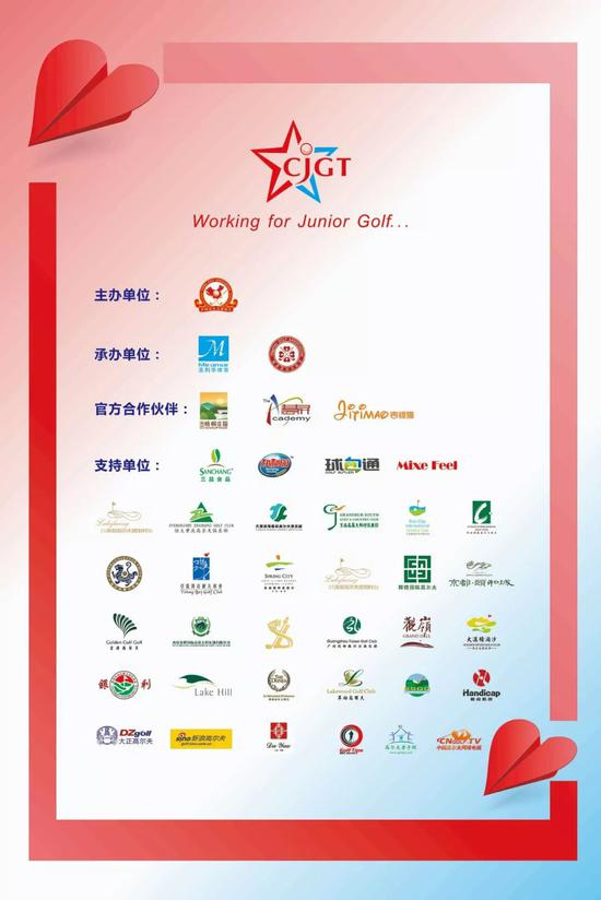今年是CJGT青少年高尔夫球队际锦标赛举办的第六年,CJGT赛事得到了各地高协、参赛单位、领队、教练、选手和家长们的大力支持,并得到了官方合作伙伴梧桐庄园、慧昇书院,支持单位CJGT指定服装吉缇猫、CJGT指定球包运输球包通,CJGT运动恢复仪器MIXE FEEL筋膜枪、能量包提供商三昌食品、和和园,CJGT官方摄影机构大垚传媒的大力支持。