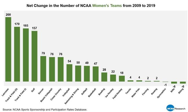 女子长曲棍球在净增长上排名第一,2009年到2019年,增加了200支队伍。户外田径(170支)和室内田径(165支)排名第二位和第三位,而女子高尔夫因为157支队伍的净增长也引人注目,排名第四位。