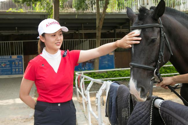 四位高尔夫球手之中三位都参与过马术运动,面对俱乐部的“黑宝”,都敢于走上前去亲近,其中厦门本土球员刘艳更是全套装备上身,进入了马场之中,与“黑宝”亲密接触。