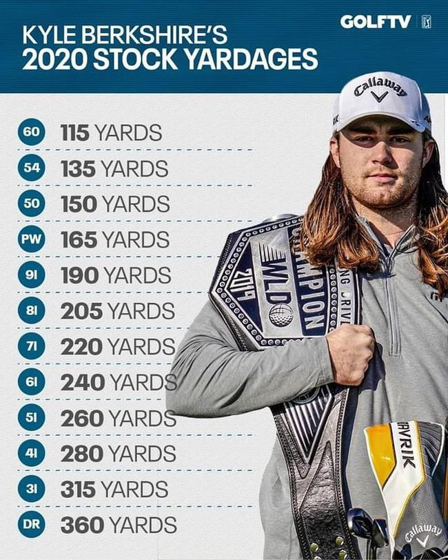 凯尔-巴克夏不时都在他的社交媒体Instagram上发布自己的挥杆视频。他已经拥有20万粉丝,而这些粉丝看到了好多他击出的“炸弹”,更关键的是,这些炸弹不只是一号木打出来的,也不都是在高尔夫模拟器上打出来的,有些在高尔夫球场上,有些在练习场上。