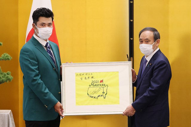 在表彰仪式上,松山英树将奥古斯塔果岭旗和大师赛帽子赠予了菅义伟。