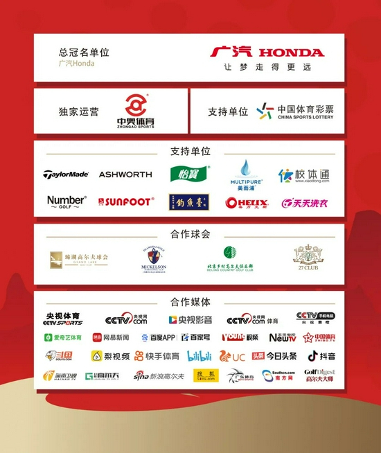 赛事获得广汽本田汽车有限公司总冠名,并获中国体育彩票、泰勒梅、雅狮威、校体通、怡宝、上足、美而浦、喜力克斯、钓鱼台丰顺、Number等众多品牌赞助商的支持。
