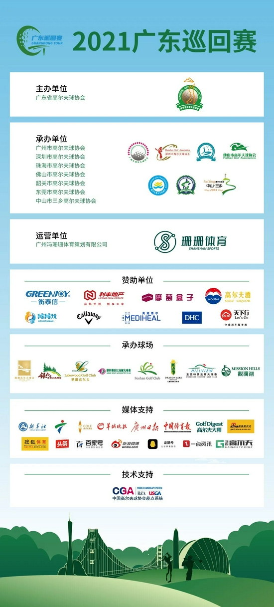 广东巡回赛,由广东省高尔夫球协会主办,广州市高尔夫球协会、深圳市高尔夫球协会、珠海市高尔夫球协会、佛山市高尔夫球协会、韶关市高尔夫球协会、东莞市高尔夫球协会、中山市三乡高尔夫球协会承办,广州冯珊珊体育策划有限公司独家运营。赛事得到包括利丰地产、衡泰信室内高尔夫、高尔夫酒、HHWAN猴猴玩运动品牌、卡拉威、Mediheal美迪惠尔、DHC中国、天下行go全球用车服务商等多个品牌赞助商的大力支持。