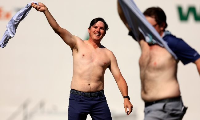 哈里-希格斯不甘下风,完全脱掉了球衫,然后绕着果岭奔跑。