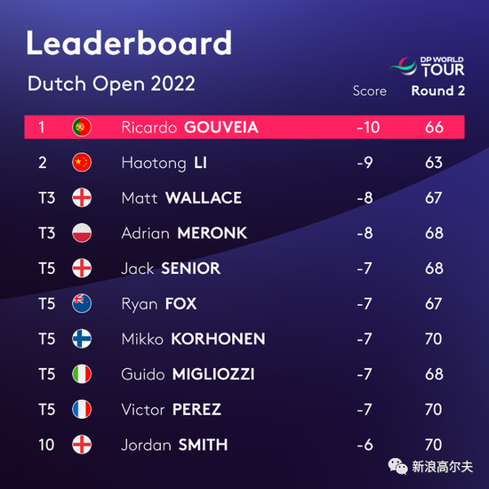 北京时间5月28日,首轮仅排名并列第72的中国球员李昊桐周五在伯纳德斯高尔夫球场(Bernardus Golf)轰出63杆(-9),飙升至DP世界巡回赛-荷兰公开赛次轮单独第二,仅落后领先者葡萄牙球员里卡多-戈维亚(Ricardo Gouveia,68-66,-10)1杆。