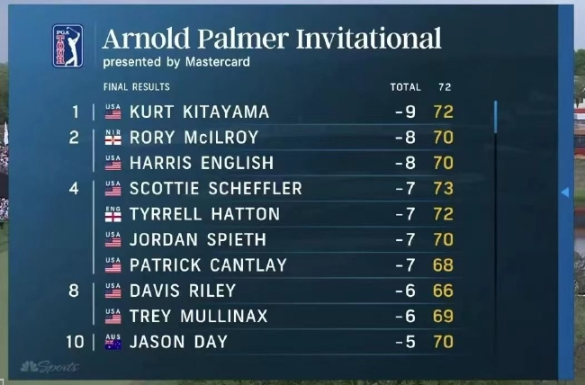 帕尔默邀请赛北山取得首冠 麦克罗伊T2舍夫勒T4