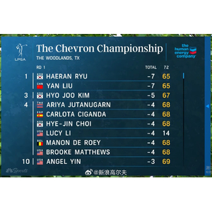 北京时间4月25日,雪佛龙锦标赛因为恶劣天气,未能如期完成第一轮。柳鲑澜(Haeran Ryu)和刘艳(Yan Liu)在得克萨斯时间星期四均打出零柏忌65杆,低于标准杆7杆,并列处于榜首。