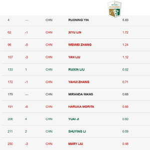 以下让我们来看一下中国排名前十选手以及她们的世界排名升跌: