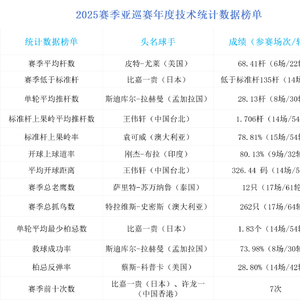 北京时间12月27日消息,2025赛季收官,亚巡赛年终技术统计数据正式出炉,榜单前列几乎被本赛季表现最为亮眼的球手们包揽。