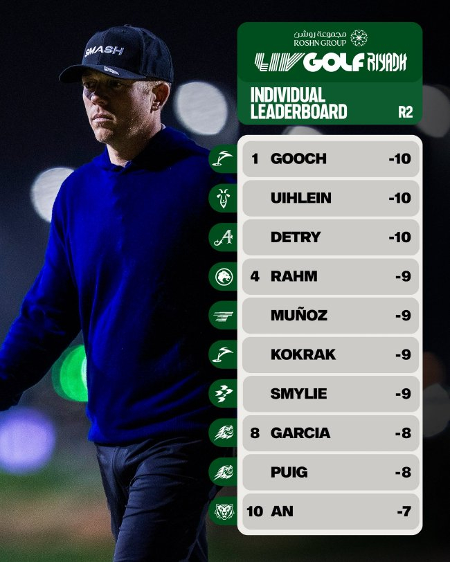 古奇首次以扣杀队队长身份参赛,在周四晚间连续第二轮打出67杆,低于标准杆5杆,以134杆,低于标准杆10杆,与另外两位选手并列领先个人赛。与此同时,他的球队在团队赛中取得三杆优势,这主要归功于简森-科克拉克(Jason Kokrak)零柏忌64杆,低于标准杆8杆,这是利雅得高尔夫俱乐部灯光下进行的36洞中,全场最低杆。