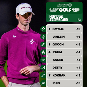 作为2026赛季重大赛制调整的一部分,联赛首场72洞常规赛季赛事将于周六晚间在利雅得高尔夫俱乐部进行第四轮之后落幕。撕裂队新成员埃尔维斯·斯迈利(Elvis Smylie)与山羊队联赛创始成员皮特·尤莱(Peter Uihlein)以200杆,低于标准杆16杆的成绩并列领先。扣杀队新任队长泰勒·古奇仅仅落后1杆,排名第三位,是两位并列领先者身后6杆范围内17名追赶者中最接近的一个。