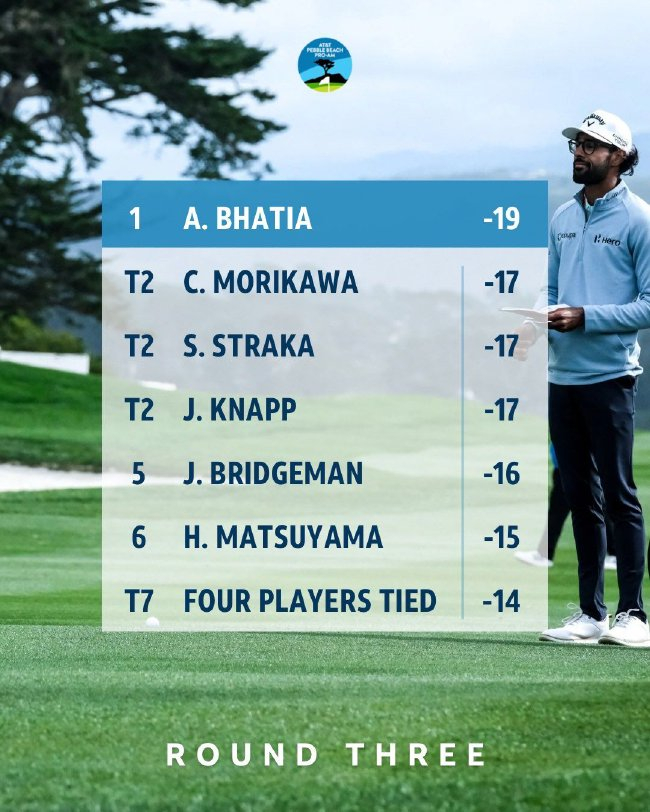 北京时间2月15日,加州时间星期六,美国选手阿克沙伊-巴蒂亚(Akshay Bhatia)凭借圆石滩前九洞的好表现,取得巨大领先,十分可惜,后九洞却下滑,最终交出68杆,低于标准杆4杆,进入圆石滩职业/业余配对赛最后一轮时领先2杆。