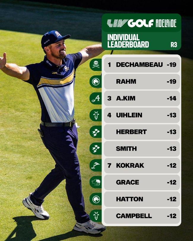 这是自2024年LIV高尔夫拉斯维加斯站以来,联赛两大巨星——拉姆和德尚博——首次在决赛轮的最后一组同组出发。周日的收官战注定将成为LIV高尔夫历史上最激动人心的决赛轮之一。
