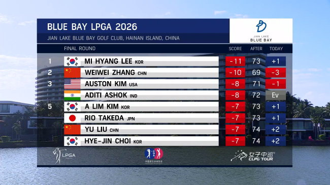 北京时间3月8日,LPGA蓝湾大师赛在海南鉴湖·蓝湾高尔夫球会展开了决赛轮的争夺,决赛轮全程伴随大风天气,赛场局势跌宕起伏,领先位置多次易主,54洞领先者、韩国球员李美香顶住中国球员张维维的疯狂追赶,以1杆优势夺得冠军。