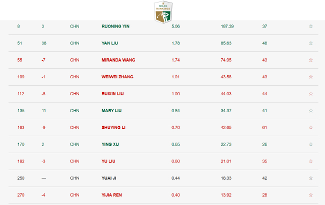 以下让我们看一下中国排名前十选手以及她们的世界排名升跌: