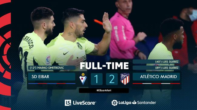之后,马竞展开猛烈的攻势,终于在第89分钟得到回报。苏亚雷斯命中他创造的点球,帮助马竞2-1逆转埃瓦尔。