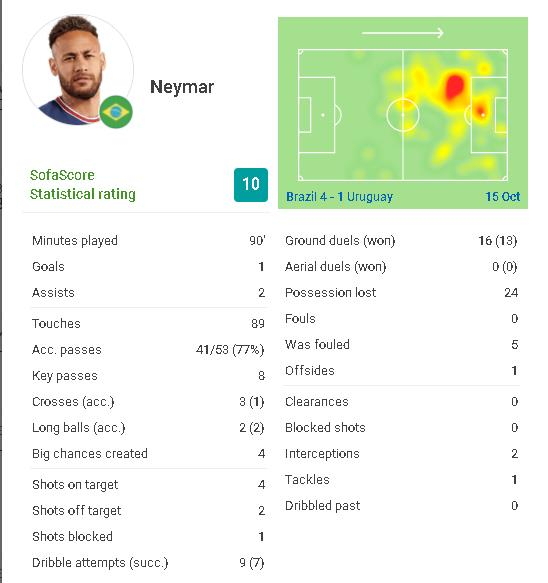 北京时间周五上午,巴西队在世预赛南美区的一场比赛中4比1大胜乌拉圭,内马尔表现神奇,球队4个进球都与他有关。