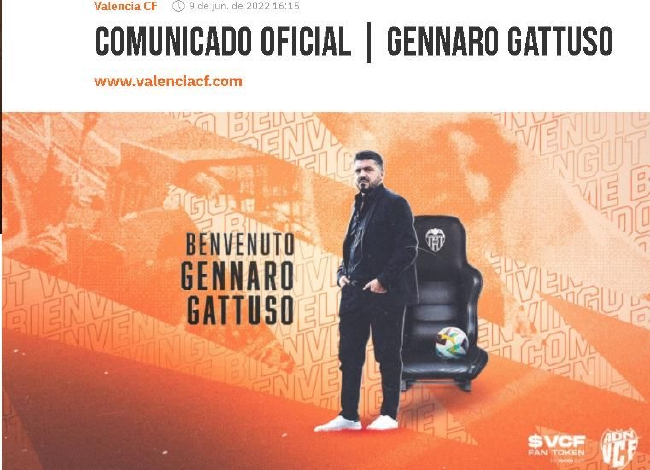 瓦伦西亚官方披露,俱乐部已经与加图索签约,意大利教练将执教到2024年6月30日。