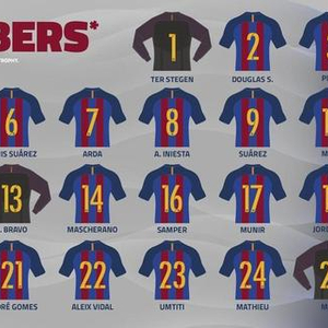 丹尼斯-苏亚雷斯将接过阿尔维斯的6号,更早之前,这个号码属于传奇哈维。桑佩尔穿上了16号,迪涅则代替离队的桑德罗,穿上了19号。安德烈戈麦斯继续身穿他在瓦伦西亚的号码21号,此前这个号码属于已经离队的阿德里亚诺。维尔马伦租借离队,乌姆蒂蒂成为23号的新主人。