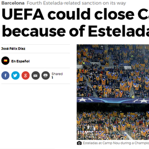 在欧冠的首轮比赛中,巴萨7-0大胜凯尔特人,为新赛季的欧冠征程开了一个好头,这本来是一件令巴萨球迷感到高兴的事,但是,《马卡报》却爆料了一件让巴萨球迷开心不起来的事情:由于诺坎普内有不少球迷在比赛中展示加泰罗尼亚独立旗帜,巴萨或将遭到欧足联的处罚,而这个处罚将很有可能就是将在未来的欧战中关闭诺坎普的某些看台。