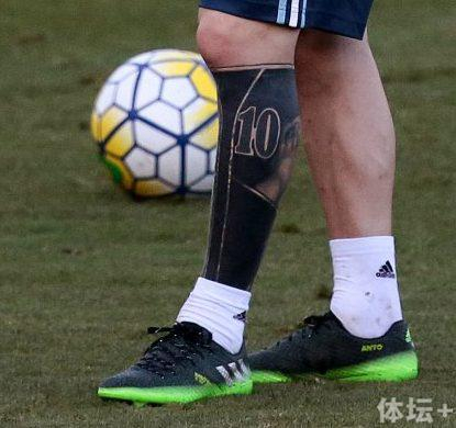 梅西已经回到阿根廷队训练,备战客场对巴西的世预赛焦点大战。而在阿根廷队的训练课中,他的左腿文身吸引了大家的注意。他的小腿被文成几乎全黑,只露出了“10号”和一只足球。有人戏称,他是文上了一只黑色袜子,其实事情并没有那么简单,“袜子”下另有乾坤。