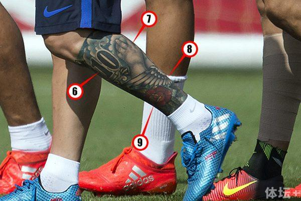 梅西的左腿本来也是装饰众多,6是“10号”,7是掌印,8是带翅膀的剑,9是花的图案。