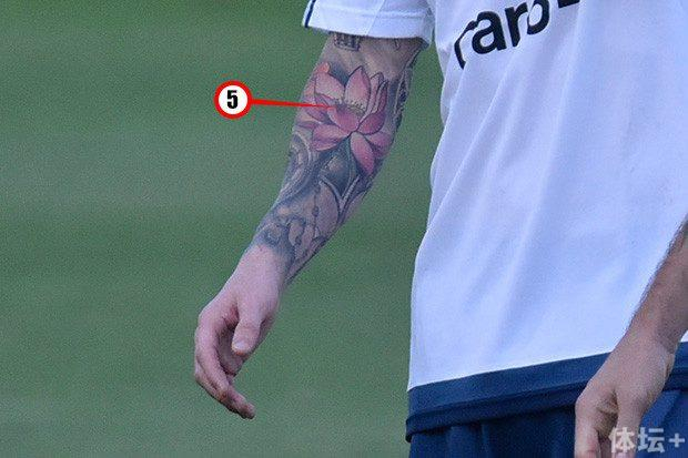 梅西的右臂简直是“琳琅满目”。1是耶稣,2是闭合的莲花,3是巴塞罗那圣家堂的玫瑰窗,5是一朵盛开的莲花。他的文身师罗伯托·洛佩斯说:“莲花象征着他的天才可以随处绽放,哪怕有力量阻止他它。圣家堂的玫瑰窗,则显示了他对巴塞罗那这座城市的爱。”