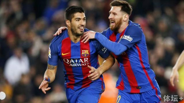 梅西跟苏亚雷斯庆祝