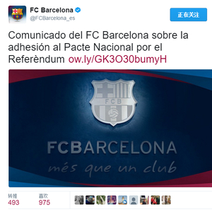 巴萨发布官方声明:支持加泰进行独立公投