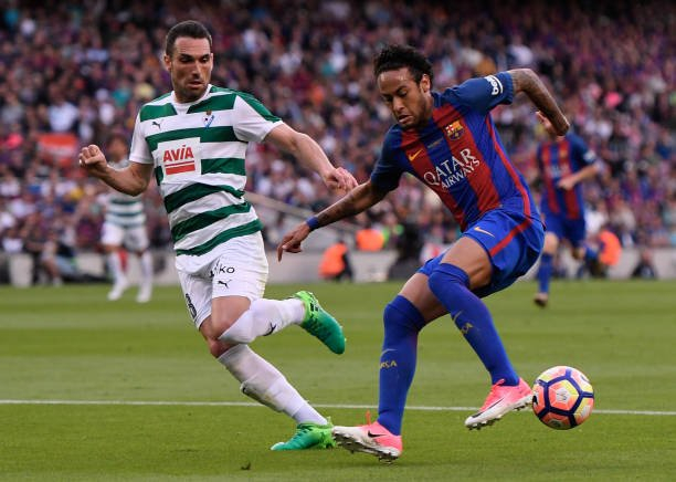 巴萨2分钟后追回一分,梅西突破3人包夹分球,内马尔禁区左侧7米处左脚推射击中远门柱弹回,洪卡门线前左脚解围,但球撞他右小腿弹进门内,1比2。巴萨继续挥霍机会,梅西直塞禁区,内马尔停球闪开后卫,在门前11米处推射偏出左门柱!