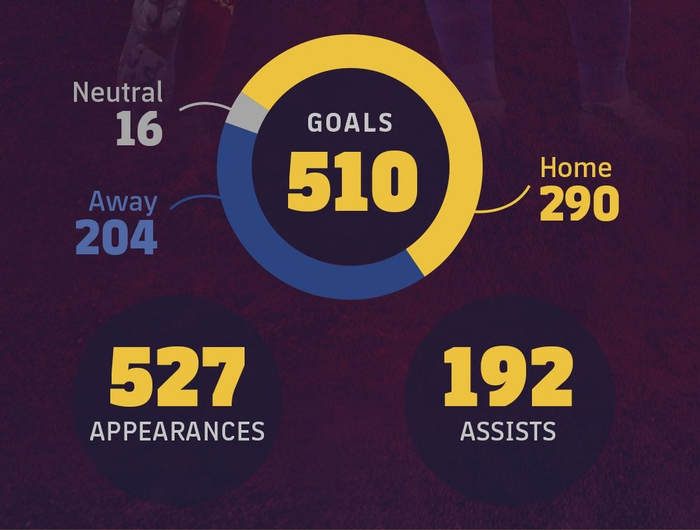 十年间,梅西一共为巴萨踢了527场比赛,打进510球,助攻192次。