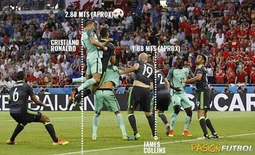 还记得2016年欧洲杯,C罗对威尔士轰进的暴力头球,他起跳后的最高点达到了2.88米,这么一算,他双脚离地能有1米的距离!