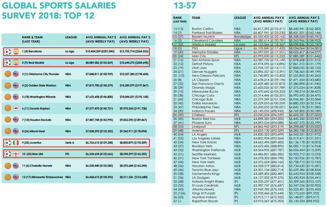 排名第二的是皇马,球员平均年薪为808万英镑。之后是NBA的俄克拉荷马雷霆以及金州勇士。 从第三到第八都是NBA球队,尤文图斯排名第9,C罗的加盟让他们的平均年薪增加不少,达到672万英镑,去年他们排名第32,今年排名上升了23位。曼联排名第十,他们也是英超平均年薪最高的球队,为653万英镑。