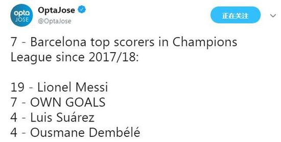 17/18赛季来巴萨欧冠射手榜:梅西第1 乌龙球第二