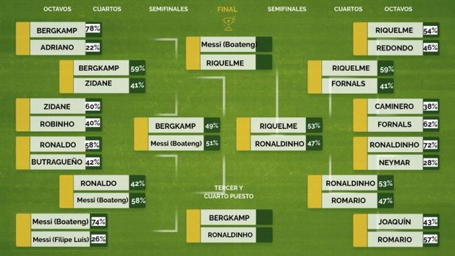 1/8决赛,梅西对博阿滕的过人淘汰对费利佩·路易斯的穿裆,1/4决赛梅西又淘汰了罗纳尔多钟摆式的过人。半决赛,梅西以2%的微弱优势淘汰博格坎普的转身过人。决赛中,梅西淘汰里克尔梅的连续磕球转身过人的动作。梅西获得的票数是54%,里克尔梅是46%。(伊万)