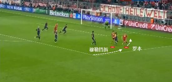 在攻防转换中,巴萨无法完成第一线的“封锁”。拜仁球员利用身体优势破开红蓝前场反抢后,往往会形成后场少打少的优势。这一次穆勒通过“挡拆”的方式,帮助罗本完成进球,更是为那场比赛留下了一个让人难忘的镜头。