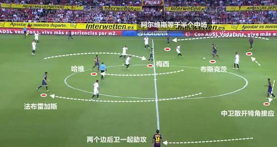客场对战塞维利亚的那场3-2绝杀,可以说是比拉诺瓦那个赛季战术思路的完美写照。从动图上可以看到,这一次布斯克茨传给梅西出现失误,对手断球后长驱直入。因为2名边后卫都已经前插,中卫也散开到犄角位置出球,所以中路有些空虚被内格雷多直捣黄龙,将比分优势一度扩大到2-0。