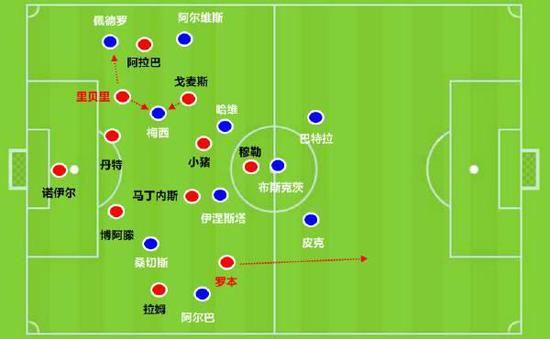 从上图可以看到,这一次里贝里在肋部的断球,随后直接带球推反击将梅西甩在身后的镜头会让很多球迷难忘。当时的巴萨,追求的是攻防转换中的加速和中场与梅西换位后的前插与二次反插。拜仁慕尼黑紧缩后场,让巴萨无法打出自身的进攻节奏,反倒是让德国人的反击冲击力优势完全释放。