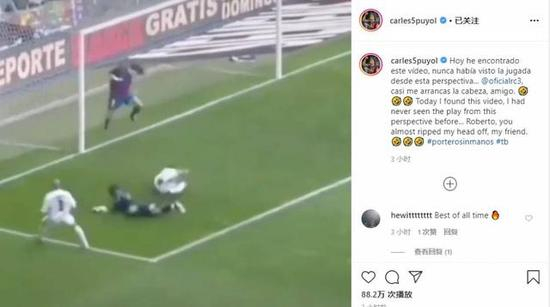 普约尔今天分享了视频并@卡洛斯:“我今天发现了这个视频,第一次看到这个视角。卡洛斯,你差点把我的头踢掉了,朋友。”