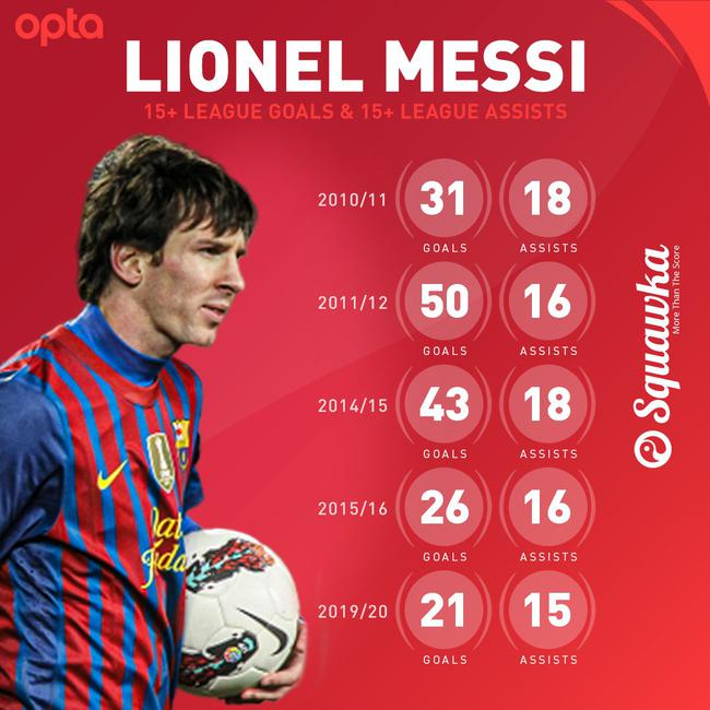 而梅西1人就有5个赛季达成如此成就,分别是在2010-11赛季(31球18助)、2011-12赛季(50球16助)、2014-15赛季(43球18助)、2015-16赛季(26球16助)和2019-20赛季(目前21球15助)。
