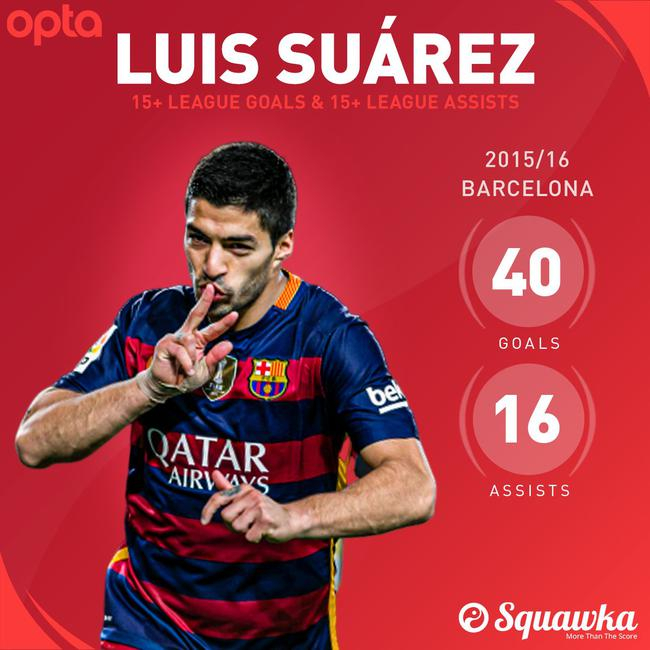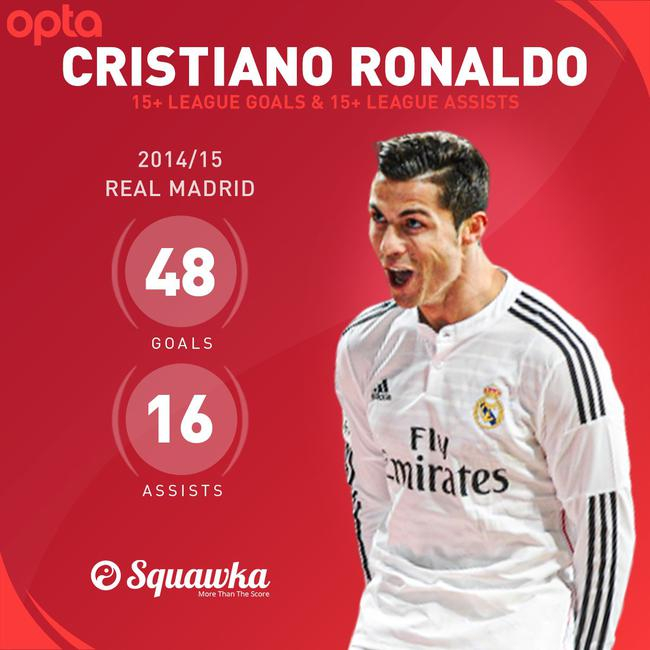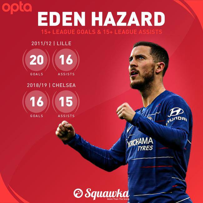 从2006-07赛季开始,只有4名球员在单赛季完成过进球和助攻都达到15+。阿扎尔有2次(2011-12赛季,20球16助;2018-19赛季,16球15助),C罗1次(2014-15赛季,48球16助),苏亚雷斯1次(2015-16赛季,40球16助),桑乔1次(17球16助)。